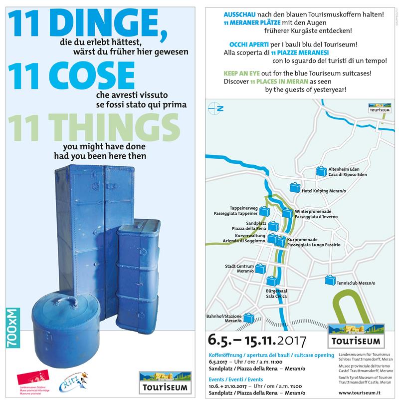 È partita lo scorso sabato 6 maggio e durerà fino all’11 novembre di quest’anno l’iniziativa del Touriseum per i 700 anni di Merano. Undici bauli da viaggio azzurri con testi e immagini e sistemati in altrettanti punti della città raccontano in che modo si tenevano occupati e si divertivano gli ospiti di cura di cent'anni fa.