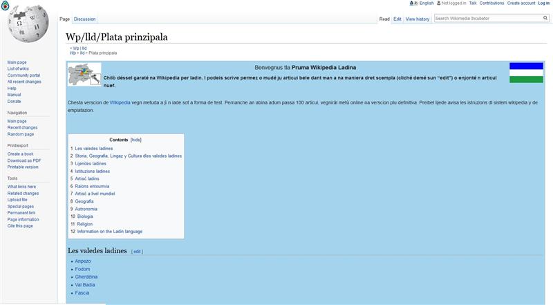 Il progetto Wikipedia ladina è stato presentato oggi (12 ottobre)presso la sede del dipartimento a Bolzano, dalla coordinatrice Rottonara e dall’Intendente scolastico ladino Roland Verra alla presenza degli esperti di Wikipedia. L’enciclopedia virtuale in lingua ladina si trova in fase di incubazione, ma può essere visionata nell’incubatore di wikimedia. A breve saranno organizzati incontri informativi nelle valli ladine alla presenza di esperti che illustreranno nel dettagli il progetto: l'obiettivo prioritario, infatti, è quello dare vita ad una vera e propria community in grado di partecipare alla nascita e allo sviluppo della Wikipedia ladina. Tutte le persone interessate sono invitate a partecipare attivamente per sviluppare i contenuti più vari quale testimonianza che la lingua e cultura ladine rappresentano una realtà vissuta.