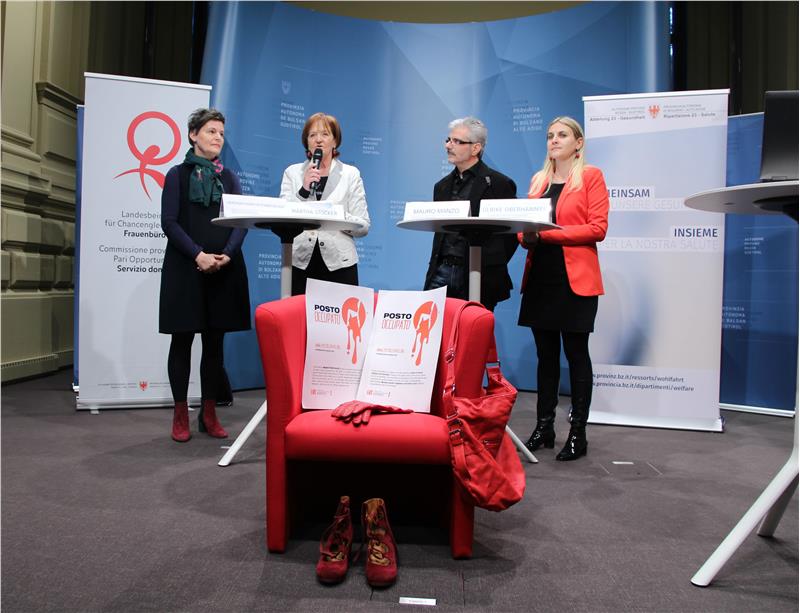 Da parte sua la presidente del Comitato per le pari opportunità, Ulrike Oberhammer, ha sottolineato che "i testimoni hanno l’obbligo di denunciare gli abusi e gli atti di violenza". Negli ultimi tre anni il numero dei femminicidi ha fatto nuovamente registrare un forte aumento ed in media ogni anno sono state uccise 150 donne. Ha quindi presentato l’iniziativa "Posto occupato" avviata nel 2013 alla quale prendono parte i Comuni altoatesini. Nell’ambito dell’iniziativa viene lasciato un posto libero a teatro, nell’autobus ed a scuola per ricordare le donne che avrebbero potuto occuparlo se non fossero state vittime di un femminicidio. Oberhammer ha esortato tutte le istituzioni pubbliche a prendere parte a questa azione "per sottolineare che il femminicidio riguarda tutte le donne". L’iniziativa sarà anche al centro della prossima copertina del periodico "ëres - frauen info donne". Al termine della conferenza stampa è stata ricordata la campagna dei fiocchi bianchi incentrata sul tema della violenza sulle donne. Come ogni anno questi fiocchi verranno inviati a uomini di spicco a livello provinciale. Chi li porterà dal 25 novembre sino al 10 dicembre testimonierà pubblicamente di sostenere la campagna e la lotta contro la violenza sulle donne.