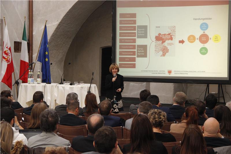 La direttrice del Dipartimento provinciale Carmen Plaseller ha ribadito l’esigenza di cambiare il modo di pensare delle amministrazioni, sia nel pubblico che nel privato che spesso non tengono il passo con le soluzioni smart: "Abbiamo da un lato un pensiero unidimensionale, dall’altro la necessità di procedere in rete." Anche l’agenda digitale Alto Adige 2020, non a caso disponibile solo online, è da considerarsi come un documento in evoluzione e costantemente aggiornato. Alla luce di best practice, video ed esperienze per adattare il territorio provinciale ai cambiamenti nel campo della digitalizzazione, nel convegno i rappresentanti di politica, amministrazione, imprese e società hanno discusso in quattro tavoli alcuni dei temi più importanti: rete digitale a banda larga, sicurezza dei dati e salute digitale, amministrazione digitale e competenze digitali. Un esempio ha riguardato la connessione della banda larga a Dobbiaco e San Candido: per allacciarla alla rete della fibra ottica, i due Comuni hanno utilizzato 42 km di condutture dell’impianto di teleriscaldamento e risparmiato in questo modo circa 3 milioni di euro. È stato infine ricordato che in tutte queste tematiche l’UE, sulla base dei finanziamenti disponibili e delle prescrizioni ai Paesi membri, garantisce il suo sostegno ma richiede per quanto possibile la creazione di sinergie.