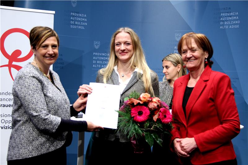 La Commissione provinciale per le pari opportunità ha premiato oggi (16 novembre) i migliori elaborati scientifici che tematizzano la condizione della donna nella società, le pari opportunità tra donna e uomo o le questioni di genere. I premi messi in palio sono intesi quali incentivo per i giovani ad approfondire le tematiche legate alle pari opportunità tra donna e uomo.