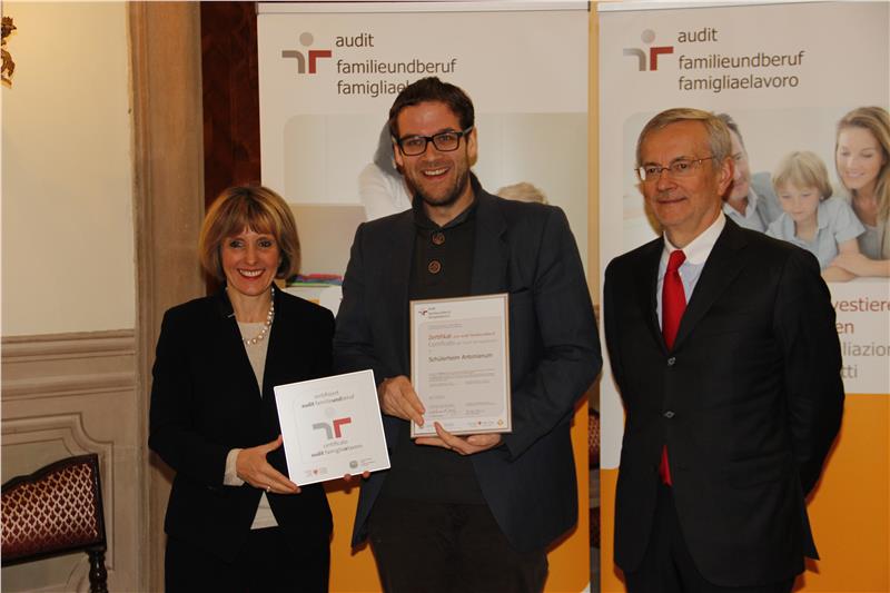 Modelli di lavoro "family-friendly" sono un aspetto centrale per chi lavora e ha famiglia e contribuiscono a motivare il personale: quest’anno 22 imprese e organizzazioni attente alle esigenze familiari hanno avviato il processo di certificazione audit e concluso con successo il primo livello. Oggi a Palazzo mercantile a Bolzano l'assessora provinciale alla famiglia Waltraud Deeg e il presidente della Camera di Commercio Michl Ebner hanno consegnato i 22 certificati audit, mentre altri 12 datori di lavoro già in possesso dell'audit sono stati ricertificati (ottimizzazione, consolidamento o dialogo). Nell'appuntamento a Palazzo mercantile il direttore della "berufundfamilie Service srl", Oliver Schmitz, e Federica Viganò, docente alla Libera Università di Bolzano, hanno parlato dello stato attuale della conciliabilità famiglia e lavoro in Alto Adige, dando particolare rilievo alle esigenze di imprese e organizzazioni altoatesine.