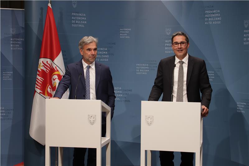 L'assessore Schuler (sx) e il presidente Kompatscher illustrano i dati dei contributi arretrati pagati. Foto: USP/sf