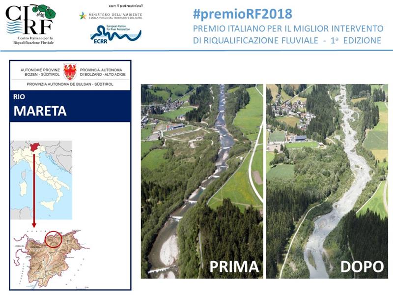 E' altoatesino l'intervento di miglioramento ambientale e sicurezza su un corso d'acqua italiano meglio riuscito decretato nel 2018. Il restyling proposto e realizzato fra il 2008 e il 2010 dalla Protezione civile provinciale per il rio Mareta, nell'omonima frazione del Comune di Racines, ha ottenuto il massimo riconoscimento nell'ambito della prima edizione del premio italiano per il miglior intervento di riqualificazione fluviale tenutosi a Bologna dal 22 al 26 ottobre scorsi. A decretarlo è stato il Centro italiano per la riqualificazione fluviale (CIRF), organizzatore del contest organizzato in collaborazione con Regione Emilia Romagna e Consorzio di bonifica dell’Emilia Centrale, al termine del IV convegno italiano sulla riqualificazione fluviale patrocinato dal Ministero dell’Ambiente e della Tutela del Territorio e del Mare (MATTM) e dell’European Centre for River Restoration.