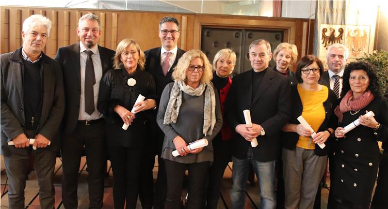 Consegnati questa mattina (19 dicembre) nella sala rosa della Regione i diplomi agli ex dipendenti – delle sedi di Trento e Bolzano, inclusi quelli del settore giustizia - andati in pensione nel corso dell’anno che si sta per chiudere. La cerimonia, che si svolge ormai da tradizione pochi giorni prima del Natale e viene impreziosita da intermezzi musicali di grande qualità dalle formazioni cameristiche dell’Orchestra Haydn - quest’anno è toccato ai fiati - è stata l’occasione per lo scambio di auguri tra la Giunta e i dipendenti e, per il segretario generale Alexander Steiner, di annunciare che lascerà l’incarico al vertice dell’amministrazione. “Ho fatto una scelta professionale e di vita – ha detto, commosso – che mi porterà ad avere un nuovo incarico a Bolzano a partire dal primo febbraio”. Nel suo discorso di commiato dopo 4 anni di incarico, il segretario ha ricordato “le molte sfide che abbiamo, tutti assieme, dovuto affrontare: di recente, la più grossa, è stata sicuramente il passaggio del personale amministrativo del settore giustizia, ma quando presi l’incarico mai avrei immaginato di dovermi occupare di una mole così grande di tematiche e problematiche di grande importanza”. Steiner ha ricordato la revisione dell’organigramma della Regione, l’armonizzazione del bilancio, la digitalizzazione, le norme anticorruzione, la riforma della magistratura onoraria, il testo unico delle società pubbliche. “Grazie all’impegno di tutto il personale e della Giunta abbiamo affrontato ognuna di queste sfide con grande impegno. Ci sono stati anche alcuni momenti di difficoltà, non lo nascondo, ma abbiamo fatto tutti del nostro meglio per il bene dell’amministrazione per cui lavoriamo”, ha concluso Steiner.