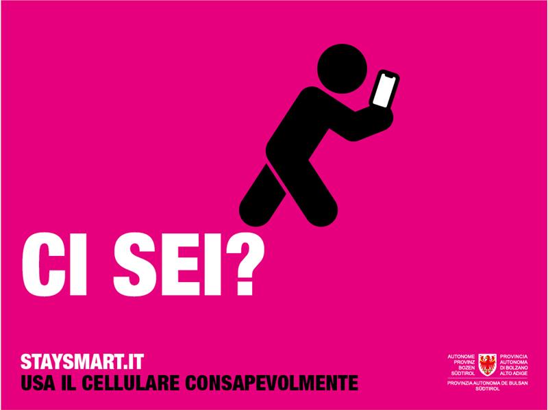 In questi giorni a Bolzano, nelle zone pedonali, airbag color fucsia installati sui pali della luce all’altezza degli occhi stanno attirando l’attenzione dei passanti e sono subito diventati "virali" sui social. La sagoma stilizzata di un omino che cammina con il capo chinato sul cellulare, induce i passanti a riflettere sull’uso eccessivo del cellulare che fa perdere di vista la vita reale. L’installazione urbana è affiancata da post pubblicati su Facebook e su Instagram nonché dalla pagina web www.staysmart.it dove sono disponibili ulteriori informazioni sulla campagna e i consigli pratici per un uso consapevole del cellulare. Partita dal capoluogo, la campagna promossa dall'Agenzia provinciale per l’ambiente e la tutela del clima, in collaborazione con l'Agenzia di stampa e comunicazione, e varie ripartizioni provinciali (sanità, intendenze scolastiche, informatica, mobilità, protezione civile), si estenderà a tutto il territorio altoatesino. "Sono contento dell’attenzione e dell’eco nei media che la campagna Stay smart ha prodotto fin da subito. L'utilizzo consapevole del cellulare è di assoluta importanza proprio per l’uso frequente che ne facciamo: usando con intelligenza i dispositivi contribuiamo alla tutela dell’ambiente salvaguardando anche la nostra salute", afferma l'assessore provinciale all'ambiente Giuliano Vettorato.
