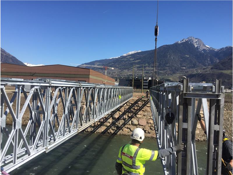 Il ponte provvisorio in metallo allestito a Maia Bassa all’altezza della cooperativa frutticola Cafa consente l’accesso dalla superstrada MeBo al cantiere sulla sponda orograficamente sinistra - Foto: Sistemazione bacini montani sud