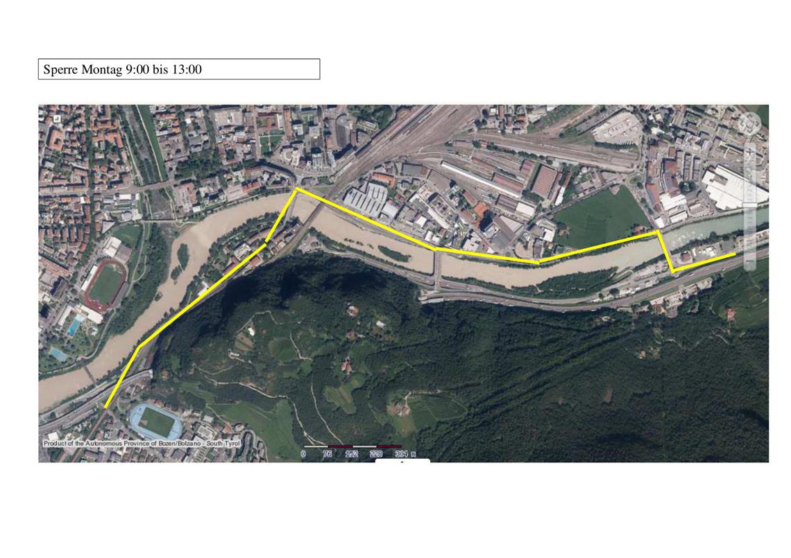 L’intervento, come confermato direttore del Dipartimento edilizia e patrimonio, Paolo Montagner, dal direttore del Servizio strade Philipp Sicher, e dal vice-sindaco di Bolzano, Luis Walcher, non è prorogabile per motivi di sicurezza, e provocherà degli inevitabili disagi alla viabilità. Dalle ore 14 di venerdì 7 febbraio, infatti, la rampa nord del ponte Virgolo lungo la SS12 sarà chiusa per consentire la copertura del metanodotto e il traffico sulla statale subirà le prime brevi interruzioni. Nelle giornate di sabato 8 e domenica 9 febbraio, invece, la SS12 sarà interrotta dalle 9.30 alle 16.30 tra il tunnel del Virgolo e l’accesso a Ponte Virgolo (che sarà percorribile per chi proviene da nord e per chi proviene dal centro città ed è diretto verso nord) per i lavori di preparazione del disgaggio, che avrà luogo la mattina seguente. Lunedì 10 febbraio, infatti, la SS12 sarà off-limits dalle ore 9 nel tratto compreso fra il tunnel del Virgolo e Ponte Campiglio, e sarà necessario chiudere anche l’autostrada del Brennero in entrambe le direzioni fra i caselli di Bolzano Nord e Bolzano Sud fra le 10.55 e le 11.10. Dalle 13 di lunedì 10 febbraio in poi, invece, la situazione tornerà lentamente alla normalità con brevi interruzioni necessarie alla rimozione del materiale. Durante le chiusure, il traffico cittadino sarà deviato su viale Trento per chi proviene da sud. L'appello, durante i lavori, è quello di evitare anche il transito a piedi lungo le rive del fiume Isarco.