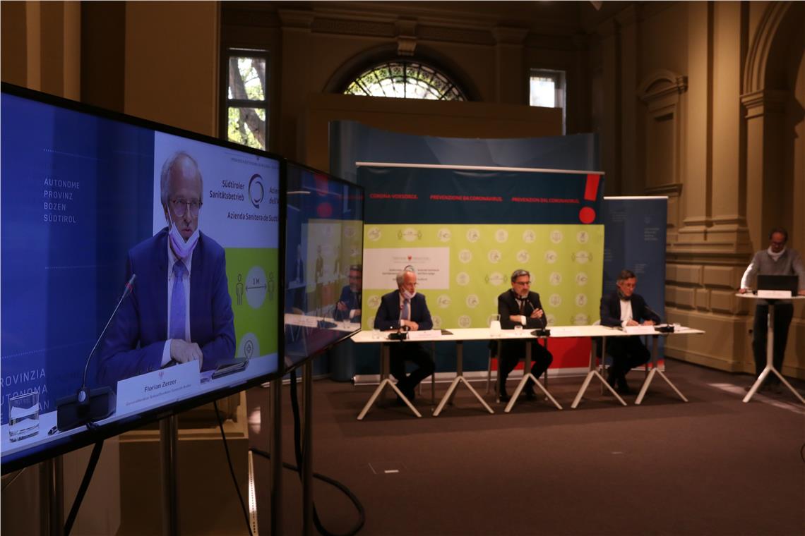Il presidente Arno Kompatscher, l'assessore Thomas Widmann e il direttore dell'Azienda sanitaria Florian Zerzer, nella conferenza stampa virtuale hanno fatto il punto della situazione-Coronavirus