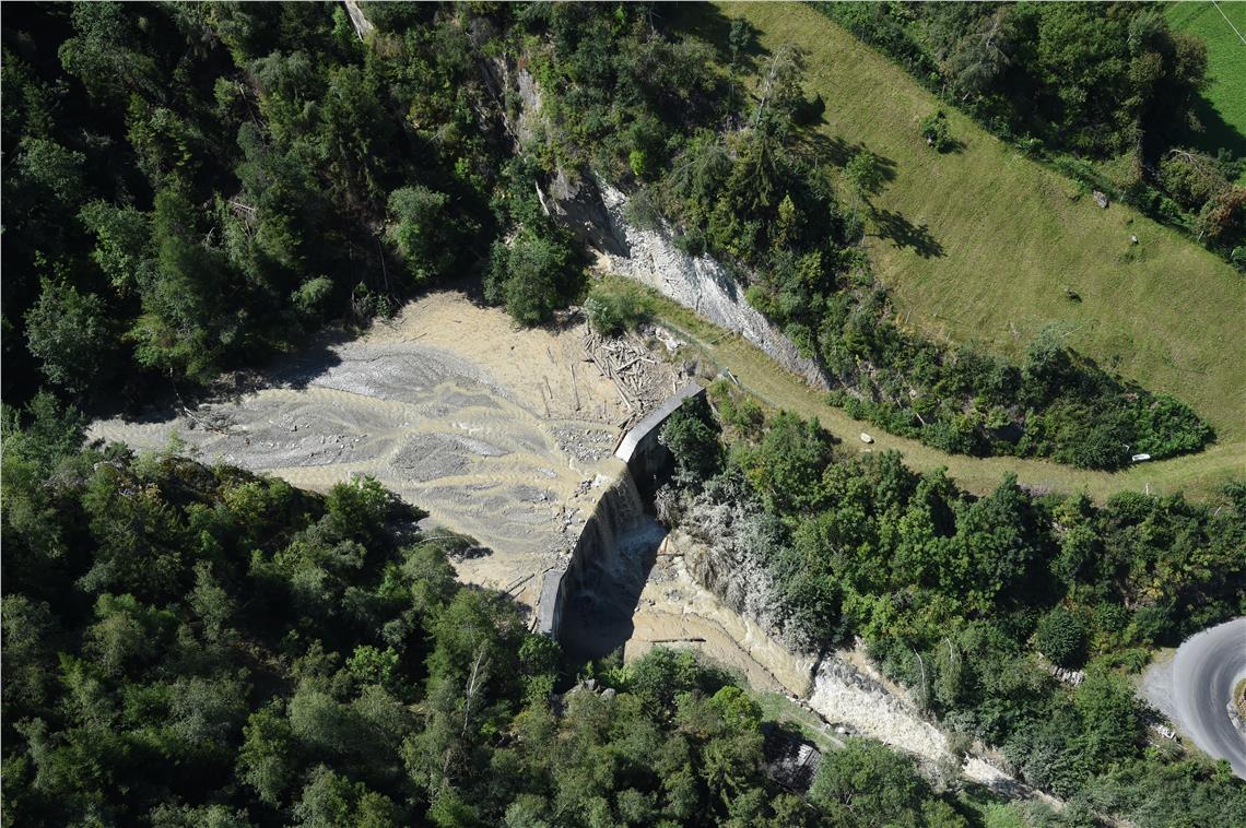 Il bacino di contenimento ha trattenuto i detriti trasportati dal rio di Cengles ingrossato per le forti piogge temporalesche di ieri. (Foto: Bacini montani ovest)