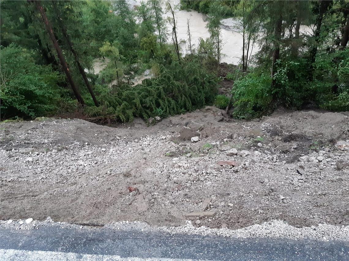 Sulla statale della Pusteria il maltempo e le sue conseguenze sul lago artificiale di Valdaora hanno provocato il cedimento nella Rienza di un terrapieno della strada vicino alla rotonda dopo Monguelfo-Tesido. (Foto: Servizio strade)