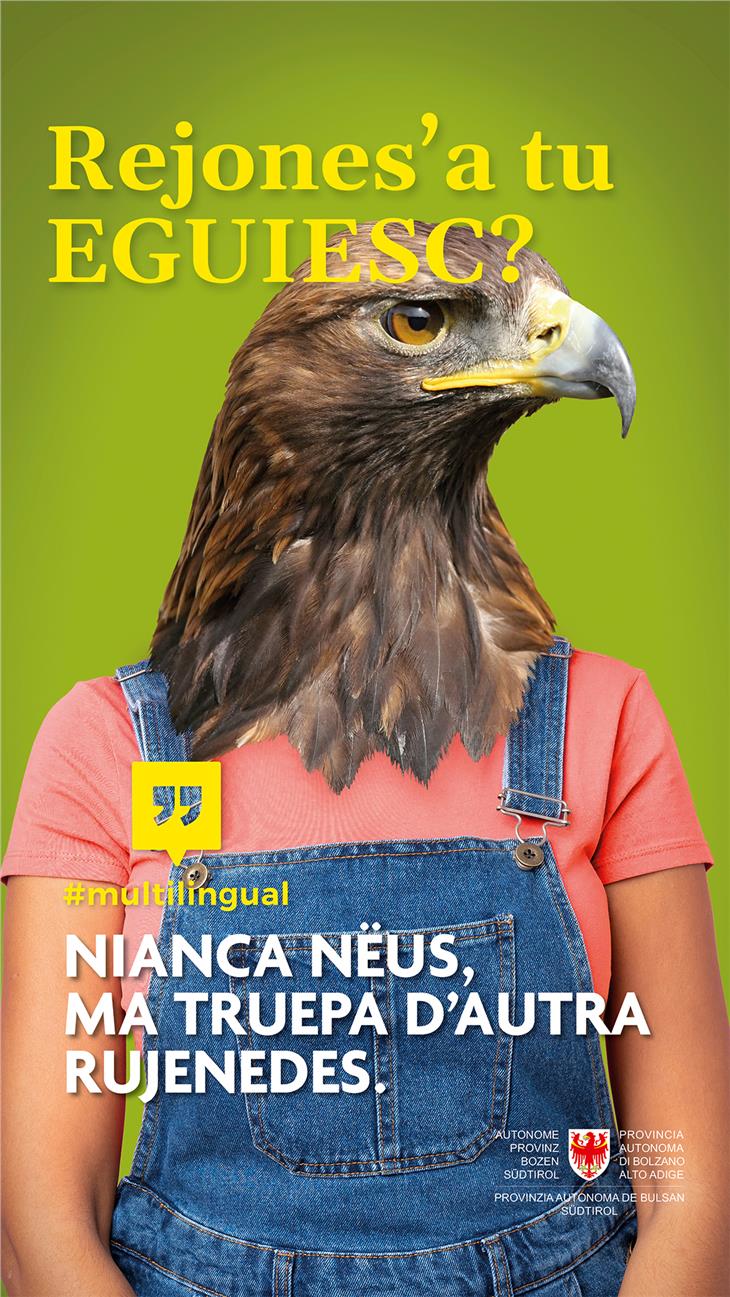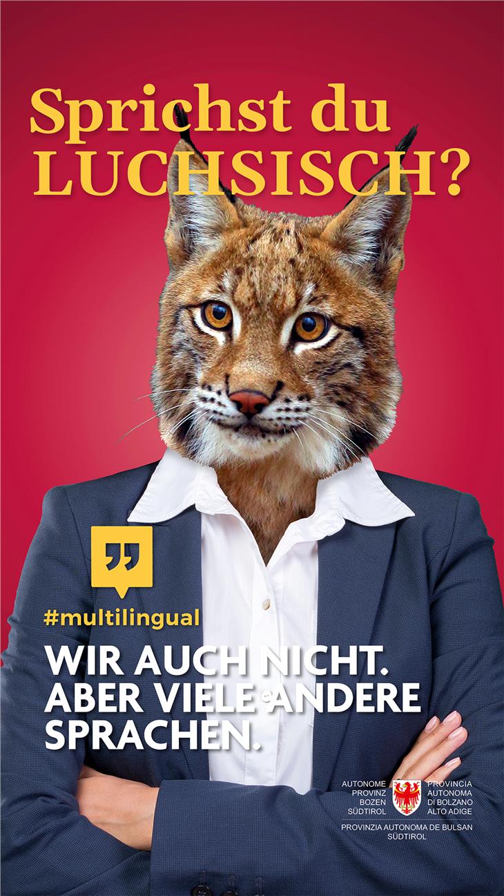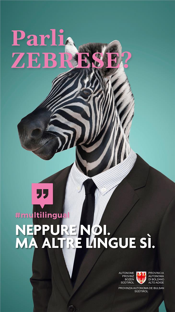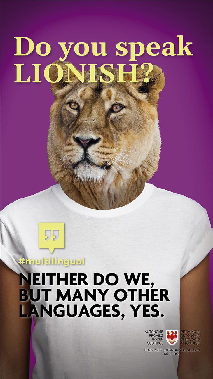 Parli zebrese? Sprichst du Luchsisch? Baieste Camaleonesc? Do you speak Lionish? Con queste domande poste su dei manifesti viene posta l’attenzione del pubblico sul tema del multilinguismo. I tre dipartimenti alla cultura e le direzioni istruzione e formazione della Provincia, congiuntamente agli operatori economici e linguistici locali, hanno deciso di avviare una campagna di sensibilizzazione al plurilinguismo rivolta alla popolazione dell’Alto Adige. La campagna verrà avviata nelle prossime settimane, con l’affissione di cinque poster in cinque lingue diverse presso le pensiline degli autobus e nelle stazioni ferroviarie di tutta la provincia. "Con #multilingual desideriamo trasmettere diversi messaggi, il primo dei quali è che parlare più lingue rappresenta un arricchimento individuale, ma anche collettivo - afferma Giuliano Vettorato, assessore alla cultura italiana - il plurilinguismo permette l’incontro tra persone provenienti da diversi ambienti culturali. Chiunque guardi oltre i propri confini linguistici e culturali, potrà allargare il proprio orizzonte e aprirsi a nuove prospettive".