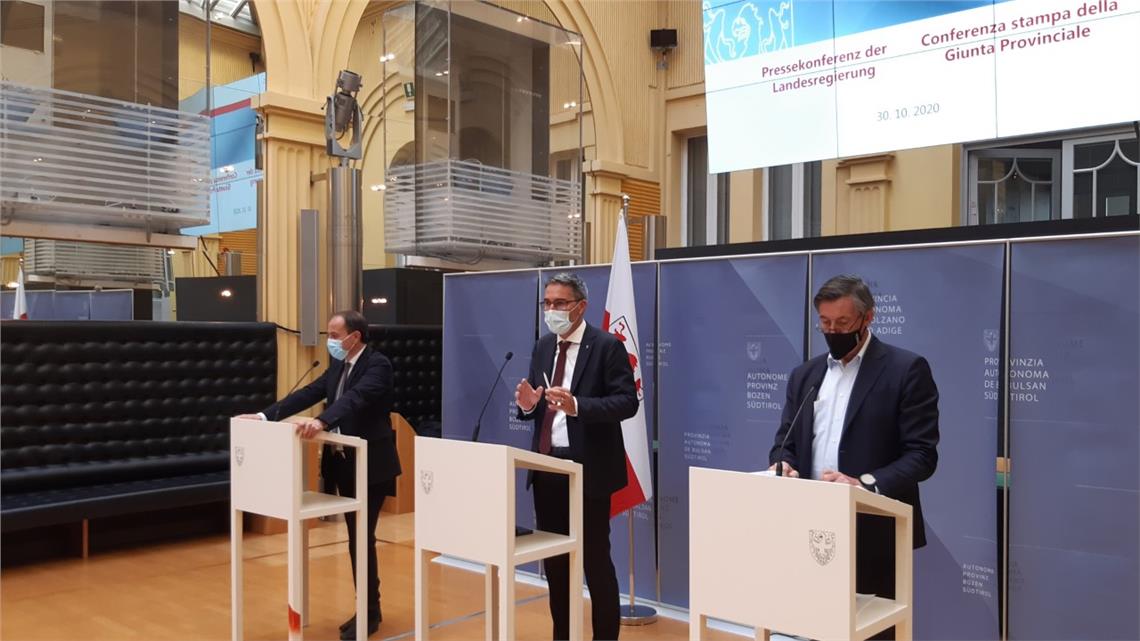 L’impennata dei contagi da Coronavirus registrata nelle ultime due settimane in Alto Adige ha reso necessarie misure di prevenzione più severe che entreranno in vigore domani (sabato 1 novembre). L’analisi della situazione è stata fatta oggi nel corso di una conferenza stampa dal presidente Arno Kompatscher, dall’assessore provinciale alla sanità, Thomas Widmann, e dall’assessore all'ambiente Giuliano Vettorato. Il Landeshauptmann ha spiegato il senso generale delle misure: "Dobbiamo agire ora - ha affermato - per spezzare al più presto la catena dei contagi, cosa che sarà possibile se tutti rispetteranno le regole. Noi vogliamo proteggere prima di tutto la vita umana, che è l'obiettivo di tutte le misure, ma anche prestare attenzione fino a dove è possibile alla tutela del lavoro, alla scuola e all'economia" (le misure dell'ordinanze saranno diffuse in un comunicato a parte).