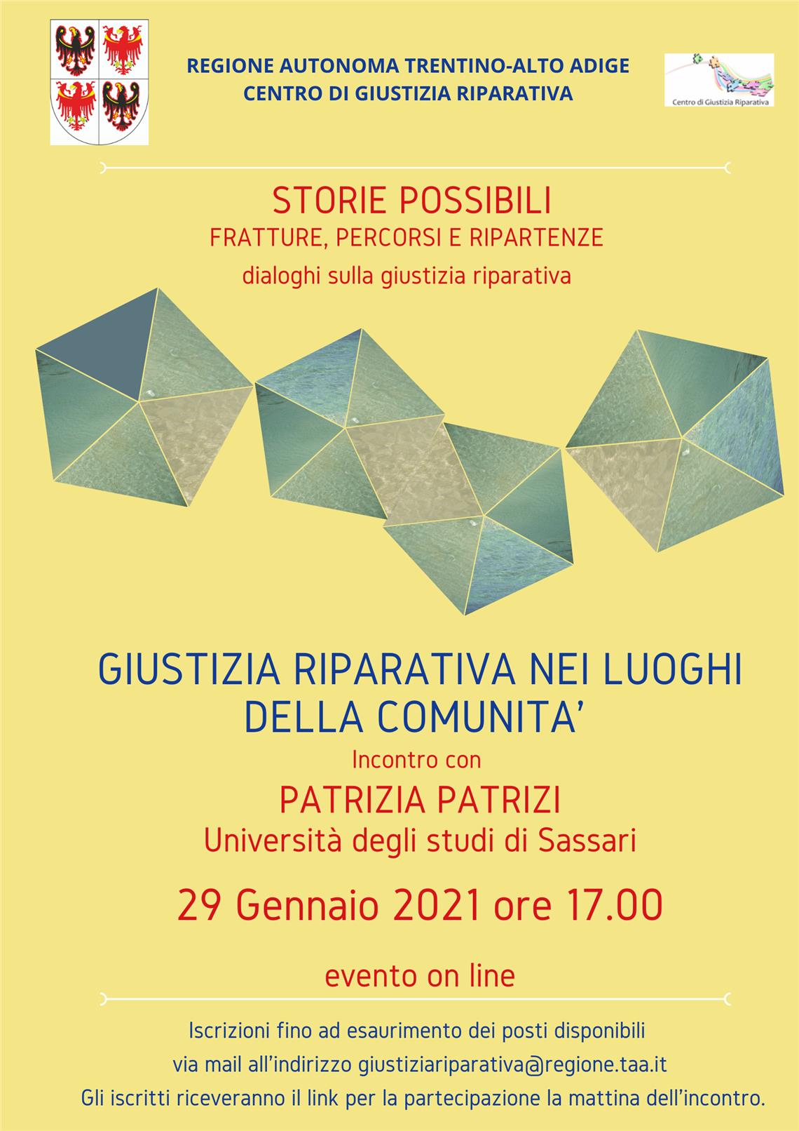 Il Centro per la giustizia riparativa della Regione Trentino – Alto Adige organizza un ciclo di incontri online dal titolo "Dialoghi sulla giustizia riparativa". Il secondo di questi appuntamenti avrà luogo venerdì 29 gennaio 2021 alle ore 17, e sarà incentrato sul tema "Giustizia Riparativa nei luoghi della Comunità". Relatrice sarà Patrizia Patrizi dell'Università degli studi di Sassari, dove insegna Psicologia giuridica e pratiche di giustizia riparativa, nonchè presidente di PsicoIus (Scuola romana di psicologia giuridica) e componente del consiglio dell’European Forum for Restorative Justice.