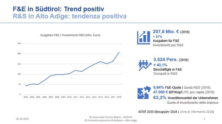 Crescono in Alto Adige i numeri della ricerca e dell'innovazione. Sale a 0,84% la quota del PIL investita in ricerca e sviluppo (fonte ASTAT). Crescono anche il numero di occupati nel settore (+ 43,1%, 3.524 persone), nonché gli investimenti complessivi da parte di istituzioni pubbliche e aziende (+27%, 207,8 milioni di euro). Di questi sviluppo positivi si è discusso ieri (2 marzo) alla riunione della Consulta per la ricerca scientifica e l'innovazione della Provincia, svoltasi in videoconferenza sotto la guida del presidente della Provincia Arno Kompatscher.