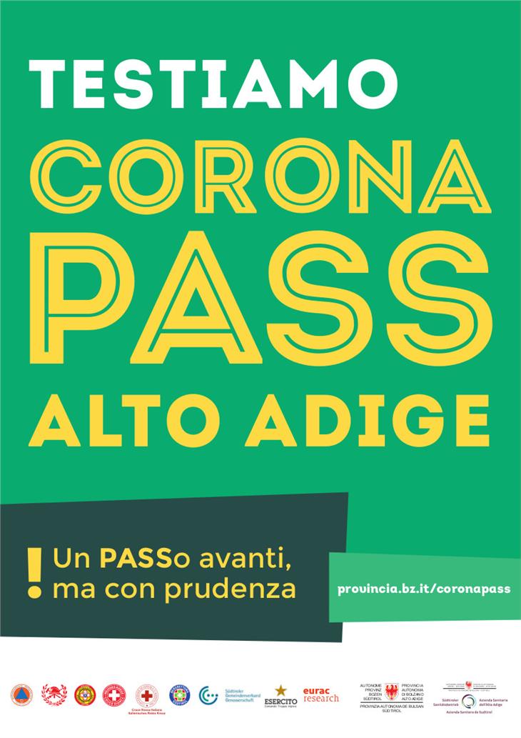 Per rendere davvero efficace il Corona-Pass, secondo l’assessore alla protezione civile, Arnold Schuler, sarà fondamentale la partecipazione all’azione “Testiamoci”, che offre test nasali gratuiti su tutto il territorio. Sino ad ora sono stati utilizzati 400.000 kit di test, a partire da lunedì 26 aprile saranno operative 80 stazioni di test in 69 dei 116 comuni dell'Alto Adige: tutte le informazioni sono a disposizione sul portale web www.provincia.bz.it/coronatest. “Questi progetti – ha aggiunto Schuler – rappresentano una grande opportunità di ripartenza per gli operatori turistici, visto che in futuro potranno essere utilizzati non solo dai residenti, ma anche dagli ospiti. Mi auguro che il mondo dell’economia partecipi e sostenga queste iniziative”.
