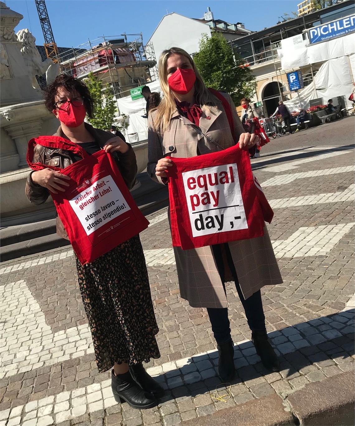 Questa mattina (23 aprile) la presidente e la vicepresidente della Commissione per le pari opportunità, Ulrike Oberhammer e Donatella Califano, hanno dato il via alla decima edizione dell'Equal Pay Day in piazza Walther a Bolzano. Materiali informativi e chiarimenti sull’azione Equal Pay Day e sul Gender Pay Gap sono stati forniti alle persone interessate dalle rappresentanti della Commissione e delle associazioni partner in vari punti in altre 12 differenti località del territorio provinciale. In particolare sono state distribuite le borse rosse con lo slogan dell’azione Stesso lavoro - stesso stipendio!". Esperte e politici avevano trattato i vari aspetti scientifici e sociali della permanenza del divario salariale, nonostante gli sforzi profusi negli ultimi anni, indicando possibili soluzioni in una conferenza online tenutasi il 14 aprile (visibile sul canale YouTube della Provincia).