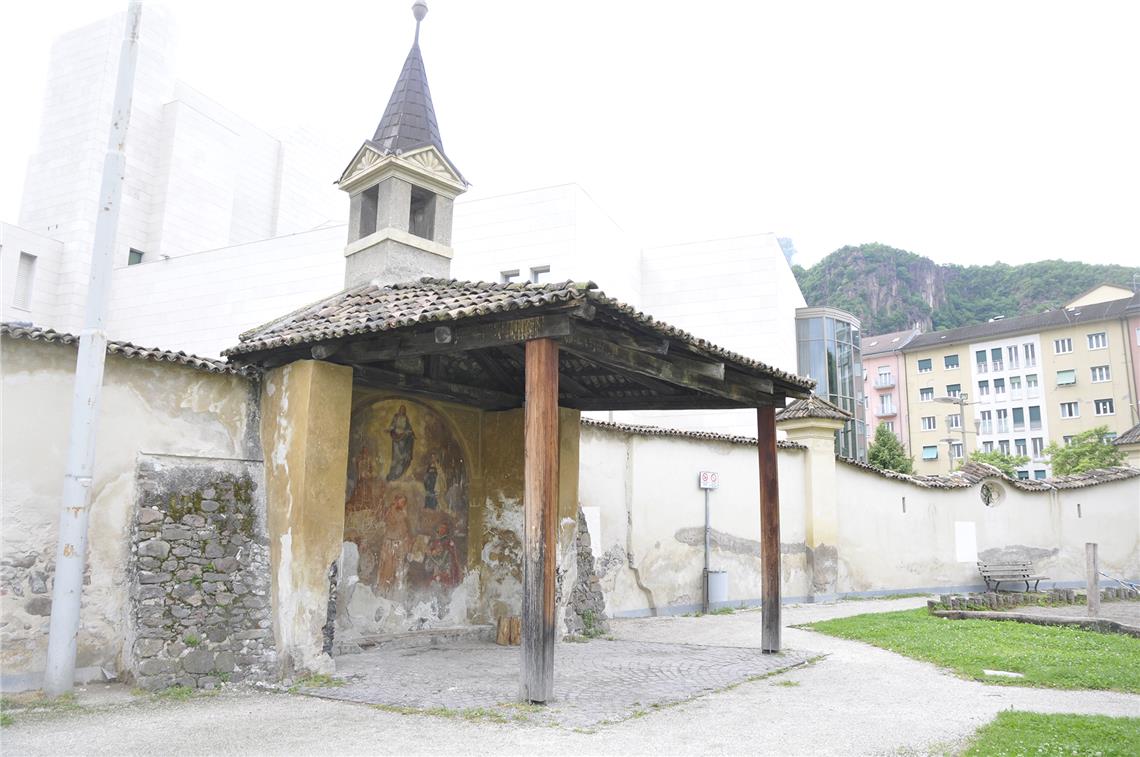 L’edicola a cappella coperta e il suo affresco lungo il muro di cinta nel Parco dei Cappuccini a Bolzano, in attesa del restauro e della protezione con una grata, viene provvisoriamente protetta da ulteriori deterioramenti e vandalismi con una parete in legno. Questi lavori, concordati dal direttore della Ripartizione patrimonio, Daniel Bedin, con la Soprintendente ai Beni culturali, Karin Dalla Torre, sono stati avviati ieri (25 maggio). Rientrano nel progetto complessivo di riqualificazione del parco nel quale la Provincia investe 1,3 milioni di euro e che dovrebbe essere realizzato entro il 2023.