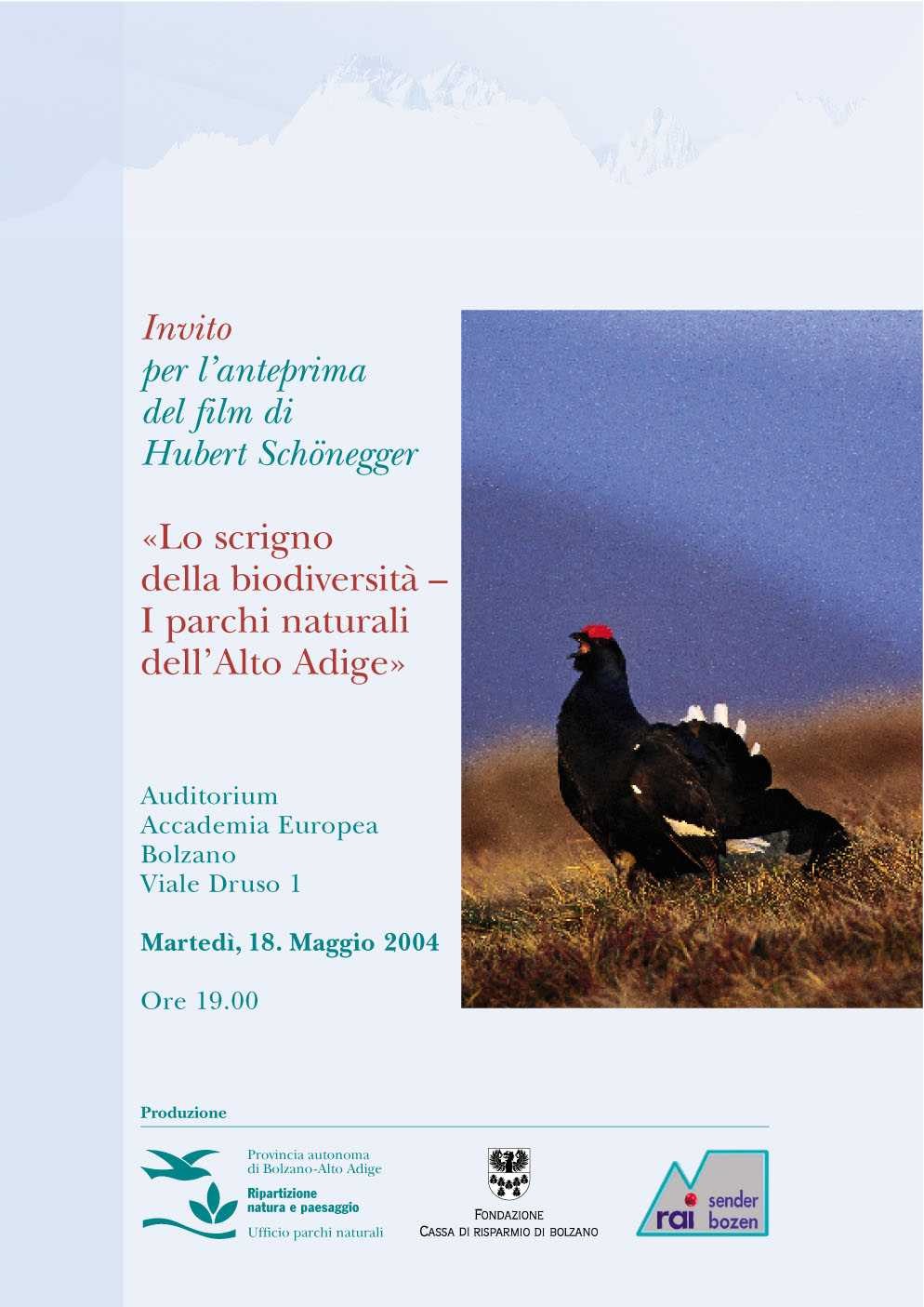 Alla proiezione, che avrà luogo in lingua tedesca, saranno presenti l'Assessore provinciale Michl Laimer, il Direttore della Ripartizione provinciale natura e paesaggio Roland Dellagiacoma, il Direttore dell'Ufficio provinciale parchi naturali Artur Kammerer, il Presidente della Fondazione Cassa di Risparmio Gerhard Brandstätter, e Rudi Gamper di Rai-Sender Bozen.mb