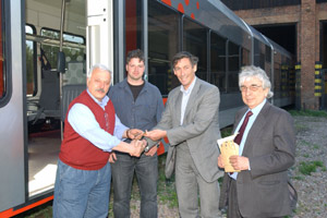 Con una simbolica consegna delle chiavi l'assessore provinciale ai Trasporti Thomas Widmann, accompagnato dal direttore di Dipartimento Gianfranco Jellici, ha preso visione del treno alla stazione ferroviaria di Merano. L'occasione ha permesso al neoassessore competente di verificare anche lo stato dei lavori di ristrutturazione della rimessa presso lo scalo meranese che fungerà da deposito per i nuovi convogli. Entro la fine di luglio arriveranno gli altri 7 treni da impiegare sulla tratta Bolzano-Malles. "Il prossimo treno che ci verrà consegnato - ha specificato Widmann - sarà inviato in Toscana, dove per due mesi sulla tratta Firenze-Pisa sosterrà i collaudi e le prove tecniche necessarie: frenatura, accelerazione, stabilità, velocità massima e minima." A sottoporre il treno alla procedura di omologazione e certificazione, che in pratica attesta la sua ammissibilità alla circolazione, sarà la Cesifer, società specializzata emanazione di Rete ferroviaria italiana.