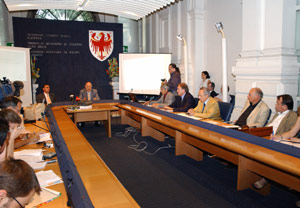 Il Presidente Durnwalder, l´assessore Theiner e i rappresentanti delle Asl locali alla presentazione del nuovo piano sanitario. (Foto LPA - Pertl)