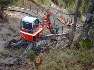 La principale difficoltà è stata rappresentata dall’inaccessibilità della gola in cui scorre il torrente. Per questa ragione gran parte del materiale necessario alle costruzione delle opere di protezione è stato trasportato con un elicottero.