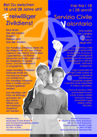 Attualmente, in Alto Adige, sono una decina i volontari in servizio, quasi tutte ragazze. C'è un solo giovane, un ventiseienne in servizio alla Casa di Riposo “Villa Armonia”. È importante quindi sottolineare che a partire da quest’anno, con l’abolizione definitiva del servizio di leva obbligatorio, tutti i ragazzi, e non solo quelli riformati, possono accedere ai bandi del Servizio civile volontario. Inoltre, il limite d’età previsto per i volontari è stato innalzato dai 26 ai 28 anni. Il Servizio civile volontario è un’esperienza di crescita personale che dà anche la possibilità di acquisire conoscenze professionali in vista di un impiego futuro. Può essere prestato nel campo delle politiche giovanili, assistenziale, culturale, ambientale, artistico, ecologico, di reinserimento sociale ed in molti altri settori. I volontari ricevono un compenso mensile di 433,80 euro, ed il periodo di attività è riconosciuto per il calcolo dei contributi pensionistici.
