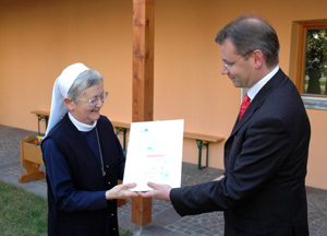 Dopo case private, condomini e hotel, la targa CasaClima per la prima volta è stata attribuita anche a un convento, quello delle Suore di Carità di San Vincenzo a Quarazze presso Merano. La loro Casa, in via Laurin, è stata "premiata" oggi (lunedì 4) a Merano dall'assessore provinciale all'Energia Michl Laimer con la targa “CasaClima A+”, il massimo riconoscimento per un edificio costruito secondo i canoni del risparmio energetico.