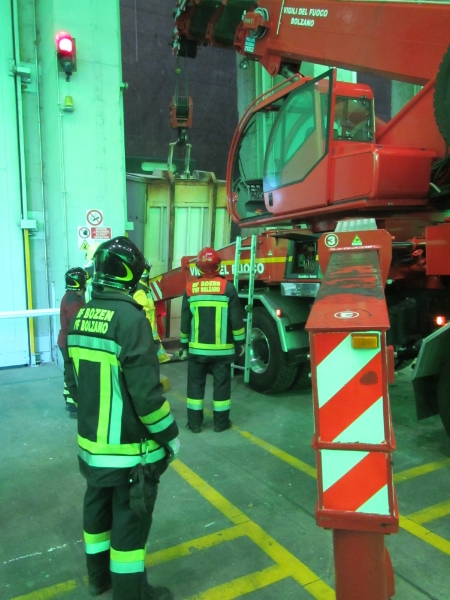 Foto BF BZ VVF BZAm Montag, den 02.11.2015 wurde die Kranmannschaft dieser Berufsfeuerwehr kurz nach 15.00 Uhr zum Müllverbrennungsofen nach Bozen Süd alarmiert. Ein LKW hatte beim Abladen von Müll den Container verloren. Dieser landete in der Mulde und behinderte dadurch den normalen Betrieb des Verbrennungsofens. Mit dem Kran der Berufsfeuerwehr wurde der Container innerhalb kurzer Zeit aus der Mulde gezogen und so konnte die Anlage wieder normal weiterarbeiten. Neben dieser Berufsfeuerwehr waren auch die Freiwillige Feuerwehr St. Jakob Grutzen im Einsatz. Verletzt wurde niemand.