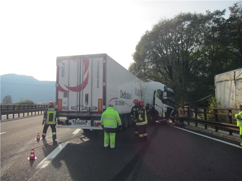 Gegen 13:00 Uhr des 20.11.2019 wurde diese Berufsfeuerwehr auf die Autobahn gerufen nachdem ein Sattelschlepper aus Litauen und ein PKW bei der Einfahrt Bozen Süd in Richtung Süden aneinander geraten waren. Dabei wurden beide Fahrzeuge schwer beschädigt. Durch das Ausweichmanöver des Sattelschlepper verlor dieser die Kontrolle und prallte mit voller Wucht in die Mittelleitplanken. Diese hielten stand und verhinderten dass das Schwerfahrzeug in die Gegenfahrbahn geriet. Durch den Aufprall wurde der Fahrer mittelschwer verletzt, während der Fahrer des Sattelschleppers einen leichten Schock erlitt. Die Aufräumarbeiten gestalteten sich als langwierig und verursachten einen ausgedehnten Rückstau. Im Einsatz standen neben dieser Berufsfeuerwehr, ein Rettungswagen des Weissen Kreuzes, Straßenpolizei und Automeisterei der A22.