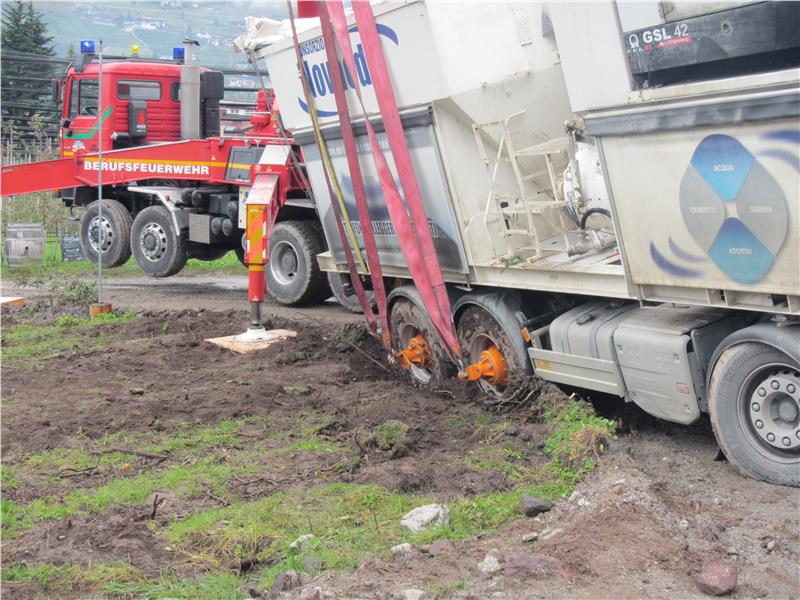 Das Fahrzeug ist bei einer Baustellenzufahrt in einer Kurve mit den Hinterrädern in das, durch die heftigen Regenfälle der letzten Tage aufgeweichte Erdreich geraten und dabei eingesunken. Das für die Herstellung von Industrieböden verwendete Fahrzeug befand sich in einer Schräglage und drohte umzustürzen.