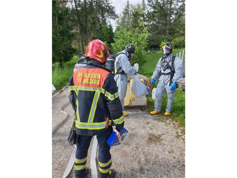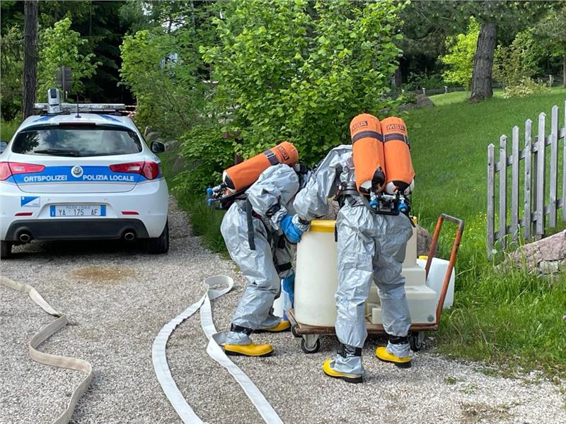 Eine Mannschaft wurde gleich am Morgen nach Völs am Schlern gerufen, wo es bei Instandhaltungsarbeiten eines Schwimmbades in einem Hotel zum Unfall kam. 2 Personen die in unmittelbarer Nähe der austretenden Flüssigkeit waren, wurden vorsichtshalber ins Krankenhaus gebracht. Die Hotelgäste waren nicht betroffen.