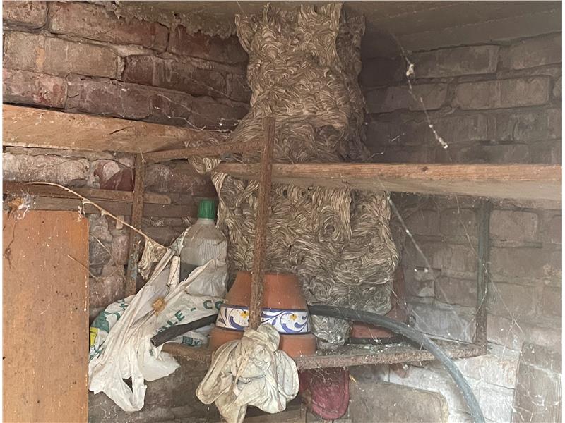 Dort angekommen stellte sich heraus, dass sich in einem Abstellraum für Gartengeräte ein ca 90x 40 cm großes Wespennest befand.
