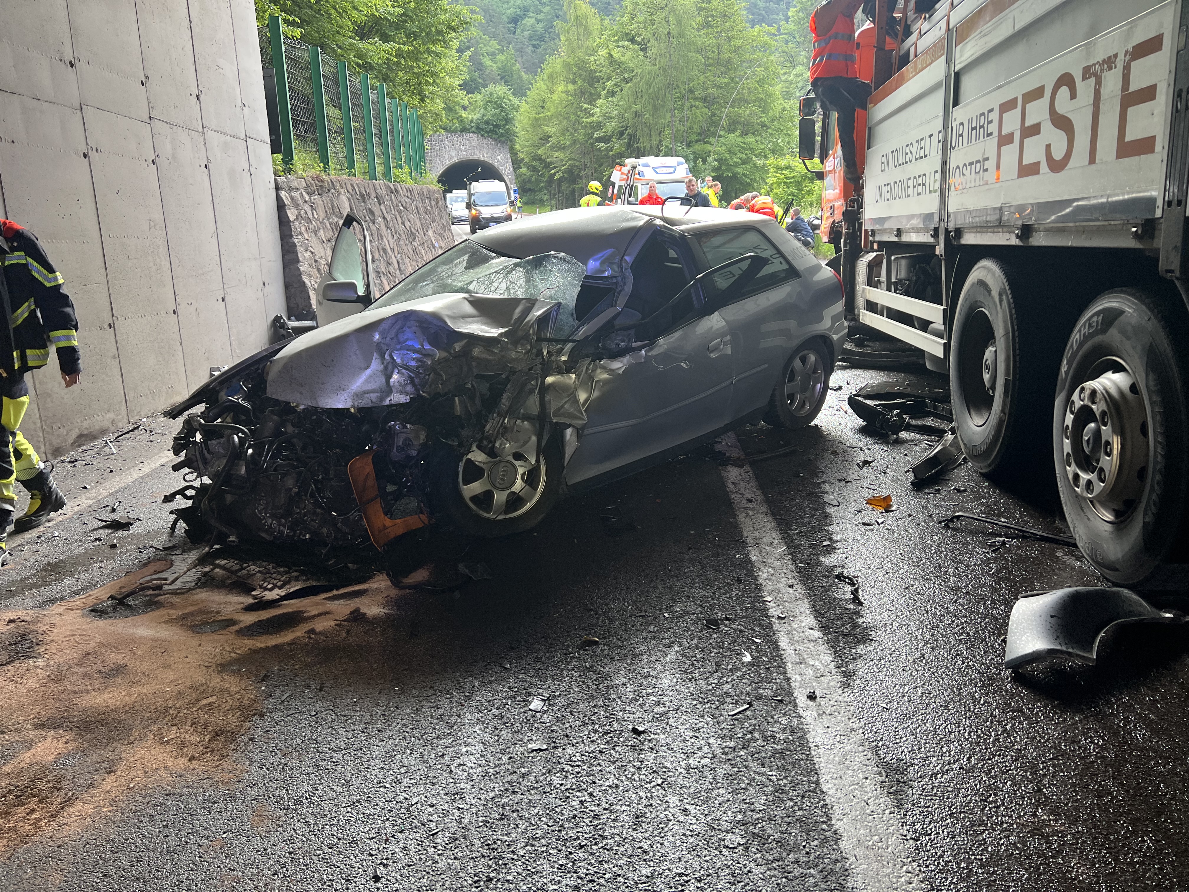 Kurz vor 7 Uhr stießen auf der Eggentalstraße in der Nähe der Fischzucht ein PKW und ein LKW frontal zusammen.
