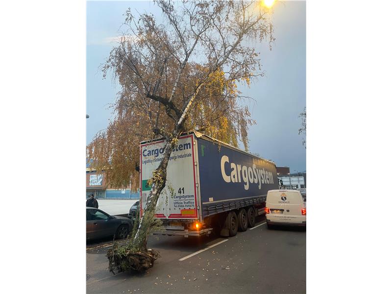 Bozen, 3. Dezember 2024 – Heute Morgen ereignete sich in der Avogadro Strasse ein ungewöhnlicher Unfall. Ein geparkter LKW riss einen Baum um, als der Fahrer den Anhänger mit der Luftfederung anhob. Dabei verhakte sich der Baum im Aufbau Anhängers, was vom Fahrer zunächst unbemerkt blieb. Der Baum wurde mehrere hundert Meter über die Avogadrostrasse mitgeschleift, bevor der Fahrer die Situation erkannte und den Notruf absetzte.