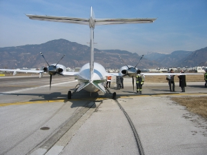 Foto BFBZ / VVFBZGegen 11:30 Uhr wurde die Flughafenmannschaft der Berufsfeuerwehr Bozen zu einem Einsatz auf das Rollfeld des Bozner Flughafens gerufen, nachdem eine Maschine des italienischen Zivilschutzes während des Landemanövers einen Reifenschaden im Bereich des hinteren, rechten Reifens erlitt. Der Pilot und sein Kopilot konnten die Maschine dabei gerade noch auf der Piste halten. Der Reifen bzw. die Felge wurden dabei so schwer beschädigt, dass die Maschine das Rollfeld nicht mehr selbstständig verlassen konnte. Da die Maschine inmitten der Landebahn stand, wurde der Flugverkehr von Seiten der Koordinatorin der Flugaufsichtsbehörde ENAC (bzw. UOP - Unità Operativa Periferica) vor Ort für die Dauer der Bergung bis 13:05 Uhr unterbrochen. Unter Verwendung einer hydraulischen Hebevorrichtung gelang es uns schließlich eine Abschleppvorrichtung des Flughafenbetreibers ABD unter den beschädigten Reifen zu bekommen und das Flugzeug anschließend in einen nahegelegenen Hangar zu schieben. Die Insassen des Flugzeugs kamen durch die technische Panne glücklicherweise nicht zu Schaden. Im Einsatz standen neben der Finanzpolizei, Carabinieri und Staatspolizei noch die staatliche Flugaufsichtsbehörde, welche Ermittlungen zum Unfallhergang einleiten wird.