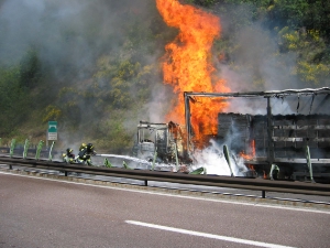 Bei einem Auffahrunfall von zwei LKW's fängt der dahinterfahrende LKW Feuer und brennt völlig aus - Große Rückstaus