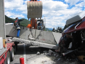 Foto BFBZ - VVFBZAm Montag, den 08.08.2005 um ca. 13.00 Uhr kam es auf der Pustertaler Staatsstrasse zu einem schweren Verkehrsunfall: ein Sattelschlepper verlor in einer Kurve bei Vintl große Betonfertigteile, diese begruben zwei Fahrzeuge unter sich. Im ersten Fahrzeug wurde eine vierköpfige Familie eingeklemmt, im zweiten Fahrzeug wurden zwei der vier Insassen eingeklemmt, ein drittes Fahrzeug fuhr noch auf das Zweite auf. Ein zufällig anwesender Bagger hob die großen Betonelemente von den beiden Fahrzeug weg, so dass die Insassen mit hydraulischen Rettungsgeräten befreit werden konnten. Der Verkehrsunfall forderte insgesamt neun, zum teil Schwerverletzte. Im Einsatz standen die Freiwilligen Feuerwehren von Niedervintl, Mühlbach, Bruneck, die Berufsfeuerwehr Bozen sowie das Weisse Kreuz und der Rettungshubschrauber Pelikan 2. Vor Ort waren auch die Strassenpolizei und die Carabinieri.