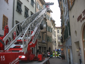 Foto BFBZ VVFBZUm 16.30 Uhr wurde die Berufsfeuerwehr Bozen zur Unterstützung des Notzartes in der Franziskanergasse in Bozen gerufen. Eine ältere Frau erlitt durch einen Haushaltsunfall in der Küche schwere Verbrennungen. Da ein Abtransport über das Stiegenhaus nicht möglich war wurde die Schwerverletzte Person mittels Drehleiter aus dem 4. Stock gerettet. Vor Ort waren das Notarztteam des Weißen Kreuzes und eine Streife der Questur.