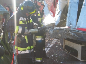Foto BFBZ - VVFBZGegen 12.00 Uhr kam es auf der A 22 in Richtung Süden zwischen Neumarkt und San Michele zu einem Aufsehen erregenden Verkehrsunfall. Ein LKW fuhr mit voller Wucht auf einem davor fahrenden Sattelauflieger auf. Dabei wurde ein Teil des Führerhauses vom Kabinenaufbau abgerissen, der LKW stellte sich quer und Landegut wurde auf die Fahrbahn geschleudert. Die beiden LKW Fahrer konnten die Kabine unverletzt verlassen. Nach ersten Sicherungsarbeiten wurden abstehende und gefähliche Teile der LKW s sowie des Sattelaufliegers mit hydraulischen Rettungsgeräten entfernt um schließlich die Bergungsarbeiten und den Abtransport der LKW s zu ermöglichen. Die Autobahn war für 2 Stunden völlig gesperrt. Im Einsatz standen neben Rettungsdienst, Behörden und Autobahnmeisterei die Freiwillige Feuerwehr Neumarkt sowie die Berufsfeuerwehr Bozen mit Unfallzug und Kranfahrzeug.