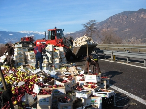 Nachdem der beschädigte Anhänger mit dem Kranwagen geborgen war, mußte die Berufsfeuerwehr zusammen mit den Kollegen der Freiwilligen Feuerwehr Terlan die auf der Fahrbahn verstreuten Äpfel mit einem Radlader und mit Hand auf drei LKW's verladen, die der Strassendienst des Landes vor Ort gerufen hatte.