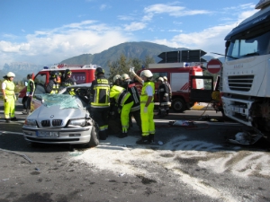Ein PKW des Typs BMW 3 wurde von einem LKW seitlich erfasst, dabei wurde der Fahrer eingeklemmt. Er konnte nach medizinischer Erstversorgung durch den Notarzt des Weissen Kreuzes nach knapp einer Stunde mit hydraulischen Bergegeräten aus dem Fahrzeug befreit werden. Der Verkehr auf der Strasse zwischen Bozen und Eppan war für ca. 1,5 Stunden gesperrt.