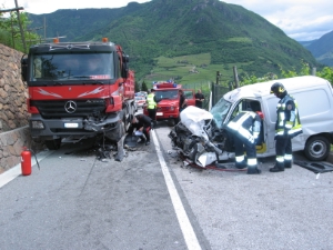 Gegen 12:00 Uhr wurde die Berufsfeuerwehr Bozen zu einem folgenschweren Verkehrsunfall auf die Landesstraße Richtung Jenesien gerufen. Ein von Jenesien kommender Kleintransporter prallte auf der Höhe des Reichrieglerhofes aus ungeklärten Umständen frontal gegen das entgegenkommende Grubenfahrzeug. Der Aufprall war dabei so heftig, dass der Lenker schwer eingeklemmt wurde. Mittels hydraulischem Rettungsgerät wurde die Person befreit und dem Notarzt übergeben. Die Straße blieb während der Rettungsaktion für mehr als eine Stunde komplett gesperrt. Im weiteren Verlauf gestaltete sich die Abschleppung des Grubenfahrzeugs als schwierig, da sich das Fahrzeug wegen der defekten Pneumatikanlage nicht mehr selbst bewegen konnte und zudem noch voll beladen war. Nach der Abschleppung mittels Kranfahrzeug auf eine Ausweichstelle konnte sich das Fahrzeug seiner Ladung entledigen. Ein herbeigeholter Tieflader transportierte das defekte Grubenfahrzeug schließlich ab. Im Einsatz standen neben den Carabinieri von Jenesien und Bozen auch ein Rettungswagen des Roten Kreuzes, sowie Notarzt, Straßendienst und Stadtpolizei von Bozen. Der Einsatz dauerte bis 15:30 Uhr.