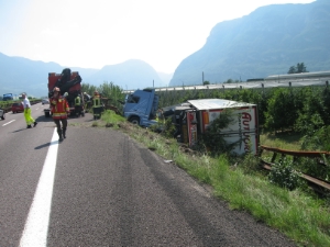 Auf der Südspur der Brennerautobahn hat sich heute Nachmittag, gegen 15 Uhr bei km 108 ein Verkehrsunfall zwischen einem VW Sharan und einem LKW ereignet. Während die Insassen beider Fahrzeuge nahezu unverletzt blieben, erlitten sowohl der PKW als auch der LKW, welcher in die nebenliegende Obstwiese stürzte, Totalschaden. In Folge des Unfalls trat aus dem LKW Treibstoff aus, die Feuerwehren brauchten ungefähr eine Stunde um den auslaufenden Treibstoff des LKW's umzupumpen bzw. aufzusaugen.