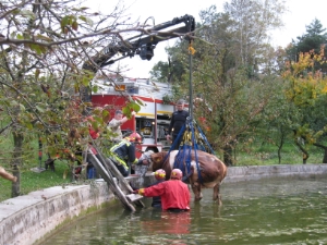 Am heutigen Nachmittag gegen 17.00 Uhr wurde diese Berufsfeuerwehr zum Stallerhof, oberhalb der Haselburg gerufen. Eine Kuh war in ein Beregnungsbecken gefallen und konnte sich aus eigenen Kräften nicht befreien. Der 84-jährige Bauer konnte die Kuh bis zum Eintreffen der Wasserrettungsmannschft beruhigen. Das Vieh wurde mit Hilfe eines Tierbergungsnetzes vom Kran des Rüstwages aus dem Becken gehoben. Sobald es wieder festen Boden erreichte konnte es unverletzt, aus eigener Kraft in die Hofstelle zurückkehren.