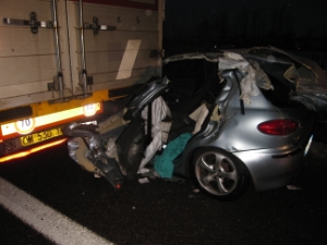 Foto BF BZ - VVF BZAm Heiligen Abend gegen 15.40 Uhr ist diese Berufsfeuerwehr zu einem Auffahrunfall auf die Brennerautobahn, Südspur in die Nähe von Neumarkt, KM 114 alarmiert worden. Ein PKW der Marke Alfa Romeo 147 ist aus noch nicht geklärten Umständen auf einem vor ihm fahrenden LKW aufgefahren und hat sich unter den Anhänger verkeilt. Der so verkeilte PKW wurde einige hunderte Meter vom LKW mitgeschliffen, bis der LKW zum Stehen kam. Man kann regelrecht von einem grossen Weihnachtswunder sprechen, denn der Fahrer wurde in den völlig unter dem LKW Anhänger verkeilten PKW schwerverletzt, aber noch ansprechbar von den Feuerwehren mit hydraulischen Bergegeräten aus dem Fahrzeug befreit. Die Beifahrerin, die nicht eingeklemmt war, erlitt mittelschwere Verletzungen. Im Einsatz waren auch die Kollegen der Freiwilligen Feuerwehr Neumarkt, das Notarztteam der Landesnotrufzentrale, das Weisse Kreuz, die Strassenpolizei und die Autobahnmeisterei. Es bildeten sich längere Staus auf der Südspur, die sich erst gegen 18.00 Uhr auflösten.