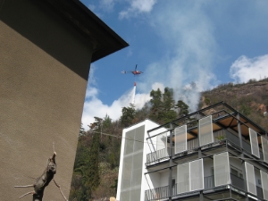 Da zum Zeitpunkt des Brandausbruches starker Wind aufkam und das Gelände sehr schwer zugänglich war, verständgte der dienshabende Einsatzoffizier BA Giuseppe Felis über die Forstbehörde einen Hubschrauber einer in Bereitschaft stehenden Privatfirma. Der Hubschrauber unternahm insgesamt 11 Flüge und warf mittels Löschkübel Löschwasser direkt auf die Brandstellen ab und konnte so sehr schnell und effizient den Brand unter Kontrolle bringen. Das Löschwasser füllte er jeweils aus einem Faltbecken in den Bozner Talferwiesen auf.