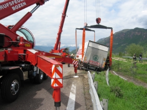 Ca. um 11 Uhr ist diese Berufsfeuerwehr zu einem LKW-Unfall auf die Schnellstraße MEBO, Nordpur in die Nähe vor der Ausfahrt Terlan KM 221+750 alarmiert worden. Ein LKW ist aus noch nicht geklärten Umständen von der Fahrbahn abgekommen und in den Straßengraben gefahren. Der Fahrer konnte mit leichten Verletzungen die Kabine verlassen. Der LKW drohte umzustürzen.