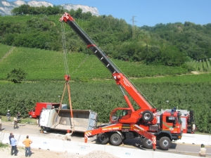 FOTO BFBZ VVFBZAm heutigen Vormittag, kurz nach 9:00 Uhr, wurde die Kranmannschaft der Berufsfeuerwehr Bozen zur Unterstützung der örtlichen Feuerwehr nach Eppan gerufen. Auf der Hauptstraße von Bozen nach Eppan war im Baustellenbereich ein mit Schotter beladenes Grubenfahrzeug umgestürzt. Am Unfall beteiligt war auch ein Pkw, welcher auf der Gegenfahrbahn in Richtung Bozen unterwegs war. Nach der Versorgung der beiden Fahrer durch den Rettungsdienst wurde mit den Aufräumarbeiten begonnen. Dazu wurde mit einem Radlader der Schotter von der Straßenbahn beseitigt und anschließend der umgekippte Lkw mittels Kran geborgen. Die Reinigung und Ausbesserung der leicht beschädigten Straßenbahn wurde vom Straßendienst durchgeführt. Durch den Unfall und der somit verbundenen Straßensperrung kam es zu längeren Staus. Im Einsatz standen auch die Feuerwehren von Eppan und Girlan, der Rettungsdienst die Gemeindepolizei von Eppan, die Straßenpolizei und der Landesstraßendienst.