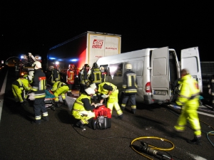 Am Samstag, den 14.08.2010 gegen 1.00 Uhr ist diese Berufsfeuerwehr zunächst von der Landesnotrufzentrale zu einem schweren Verkehrsunfall nach Blumau alarmiert worden. Ein PKW des Typs Fiat Punto geriet dort kurz vor der Einfahrt in die Ortschaft, aus bisher ungeklärten Gründen ins Schleudern und prallte in die Zufahrtstore der sich dort befindlichen Pumpstation der Gemeinde. Die beiden Insassen verletzen sich dabei mittelschwer bis schwer und wurden mit hydraulischen Rettungsgeräten in Zusammenarbeit mit der Freiwilligen Feuerwehr Kardaun befreit. Die Staatsstraße blieb bis zum Ende der Arbeiten in beiden Richtungen für ca. 1 Stunde gesperrt. Gegen ca. 4:30 wurden wir schließlich auf die Südspur der Autobahn A22 zwischen Bozen Nord und Bozen Süd, kurz vor der Einfahrt in den Virgeltunnel, gerufen, nachdem ein Kleinbus mit polnischen Kennzeichen auf einen Sattelschlepper aus der Slowakei, wiederum aus noch nicht geklärten Umständen, aufgefahren war. Die 5 Insassen wurden dabei schwerstens eingeklemmt und konnten nur mit hydraulischen Rettungsgeräten befreit werden. Auch hier mußte die komplette Südspur für ca. 1,5 Stunden gesperrt werden. Die Rettungsaktion gestaltete sich als schwierig, da der Kleinbus zusätzlich im Hinterbereich große Mengen an Reisegepäck geladen hatte, welches ungesichert durch den Aufprall nach vorne rutschte und die Insassen auf kleinstem Raum einquetschte. Im Einsatz waren neben dieser Berufsfeuerwehr ausserdem auch noch folgende Organisationen: Mehrere Rettungswagen des Weissen und Roten Kreuzes, Notärzte aus Bozen und Brixen, die Freiwilligen Feuerwehren von Klausen und Kardaun, sowie Strassenpolizei und Straßenmeisterei der Autobahn.
